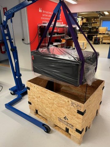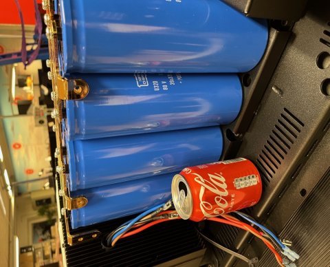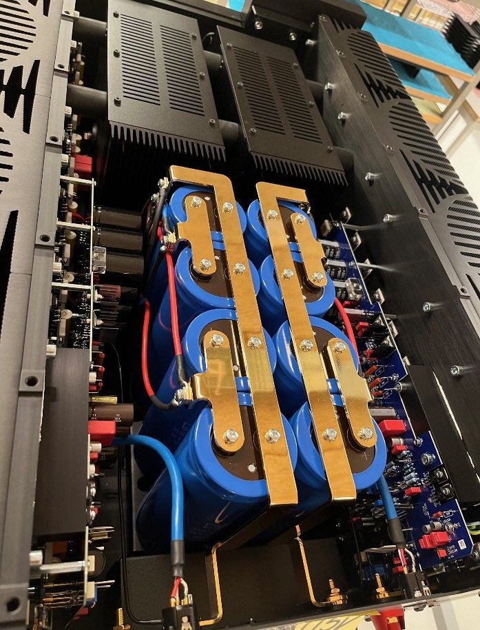 På det ene billede kan ses kondensator banken på 8x120.000uF, på et andet billede kan ses den færdige forstærker (vejer 230 kg.) hejst ned i en kasse.