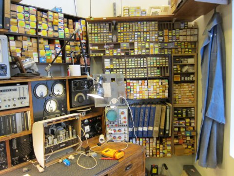 værkstedet. Her er alle vægge beklædt med reoler med servicebøger, måleinstrumenter til